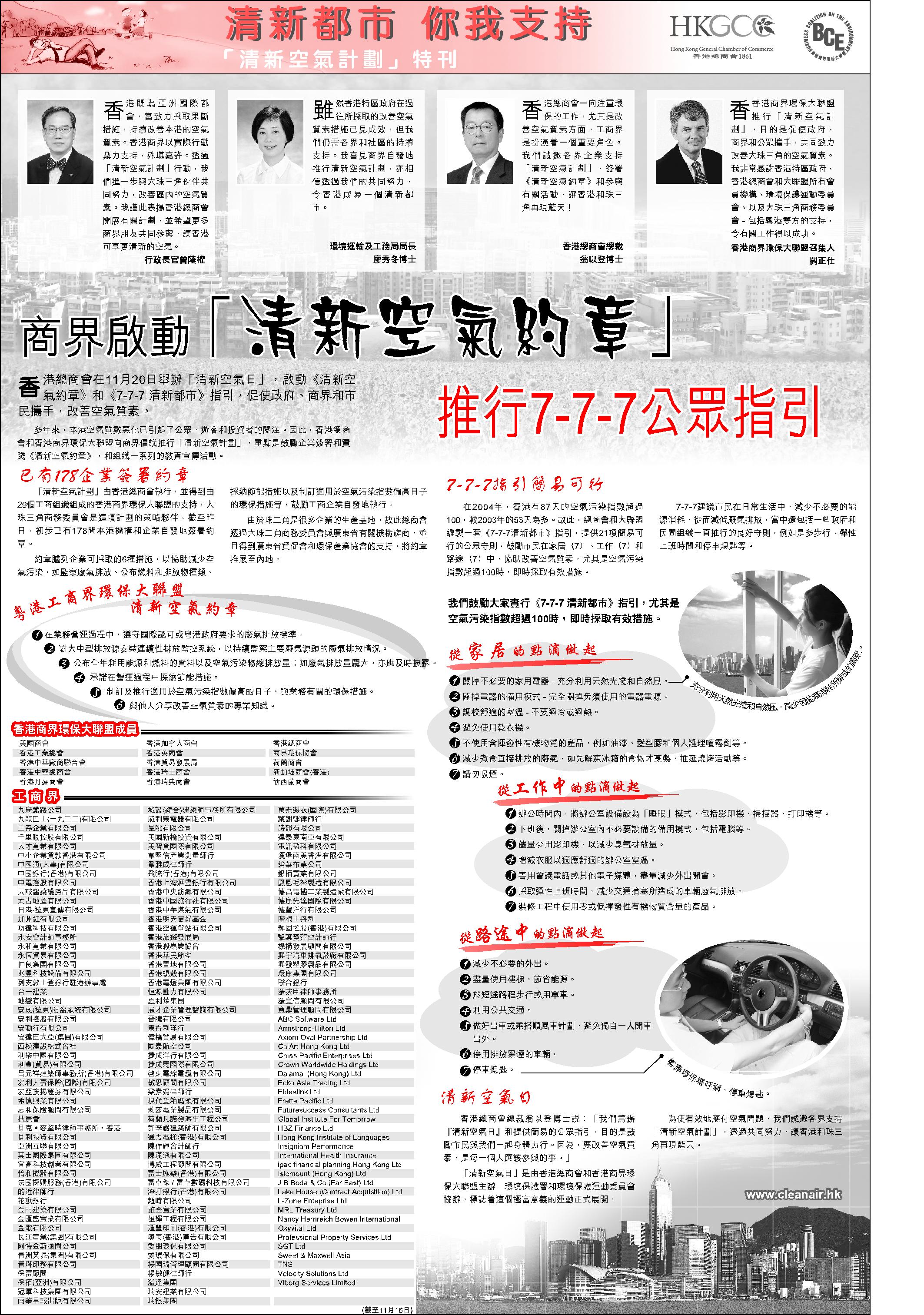 香港總商會和香港商界環保大聯盟倡議的「清新空氣計劃」,與香港特區政府的「藍天行動」攜手,在2006年11月27日主辦「商界攜手.共享藍天」大型商界會議。行政長官曾蔭權先生在會議中演說,並代表香港特別行政區政府簽署「清新空氣約章」