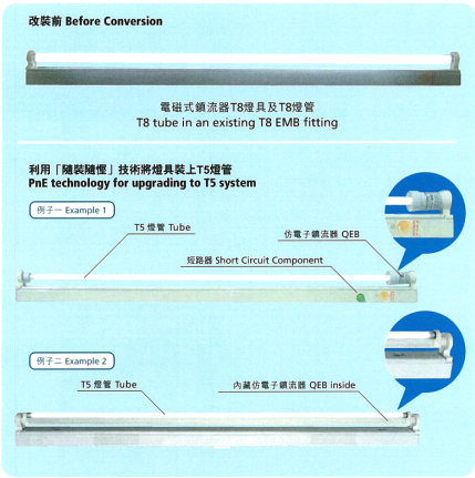若要将照明设备改良为T5系统,可用T5光管替代T8光管,并以仿电子镇流器(QEB)作为灯管尾盖,或将其装于灯具内。